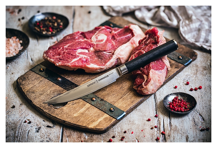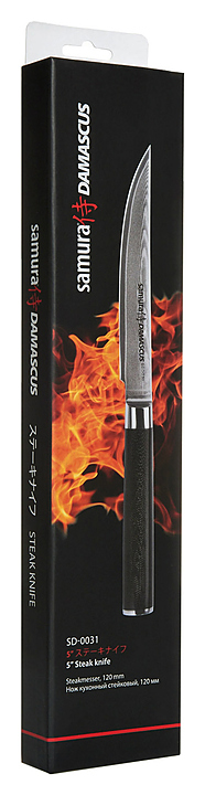 Нож для стейка Samura Damascus SD-0031/Y предназначен для нарезки стейков, мяса и пиццы на предприятиях общественного питания и торговли, в частных домах и квартирах. Центральная часть ножа выполнена из высококачественной дамасской стали V-Gold-10 и защищена 67 слоями обкладок из более мягких сталей - благодаря этому режущая кромка долго сохраняет безупречную остроту, а сердцевина надежно защищена от механических повреждений при работе. Ручка изготовлена из стеклопластика G-10. Особенности: