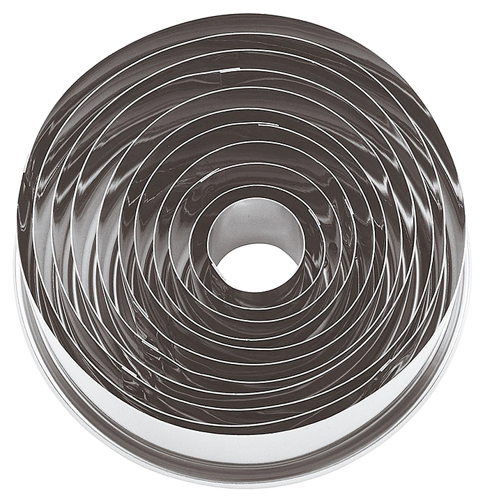 Набор кондитерских выемок Paderno 47316-20 используется на предприятиях общественного питания и торговли для придания круглой формы тесту, мастике, помадке и другим продуктам для дальнейшего выпекания в ротационных, хлебопекарных и конвекционных печах, пароконвектоматах, жарочных и духовых шкафах, а также для составления десертов, салатов и других блюд, состоящих из нескольких слоев. Отсутствие дна позволяет легко и аккуратно извлечь готовый продукт. Изделие выполнено из качественной и устойчивой к коррозии нержавеющей стали. Дополнительные характеристики: