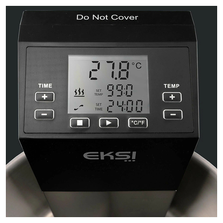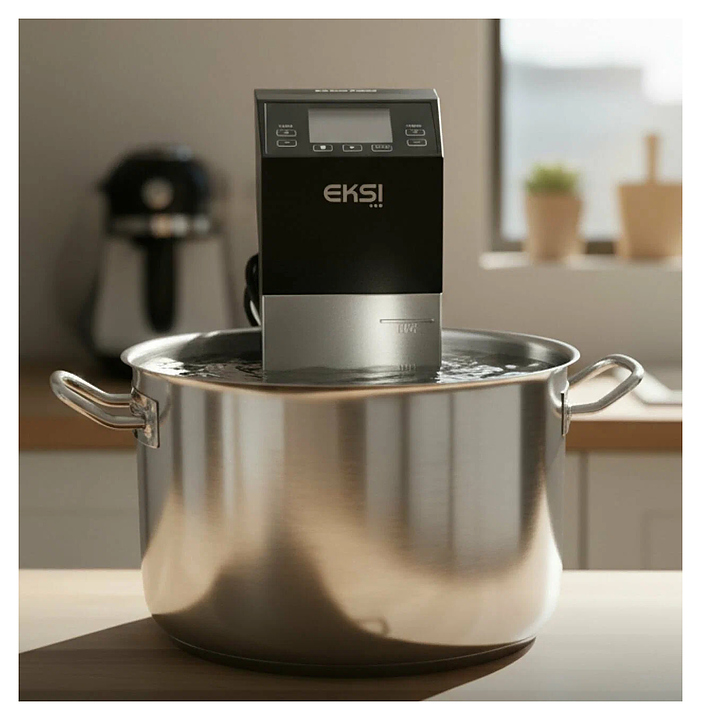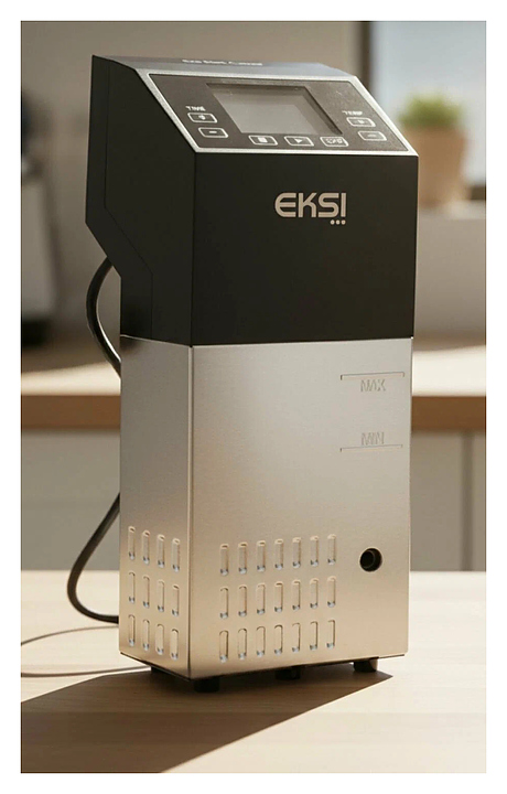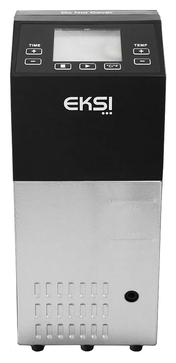 Погружной аппарат Sous Vide EKSI EV-01 используется в частных домах и квартирах для приготовления пищи в герметичных пакетах в горячей воде при невысоких температурах, что позволяет сохранить в продуктах все питательные вещества, витамины и минералы и обеспечить насыщенный вкус мяса и овощей. Модель оснащена цифровой панелью управления с ЖК-дисплеем, терморегулятором, таймером на 24 часа и сигналом оповещения о низком уровне воды. Корпус выполнен из нержавеющей стали. Дополнительные характеристики: