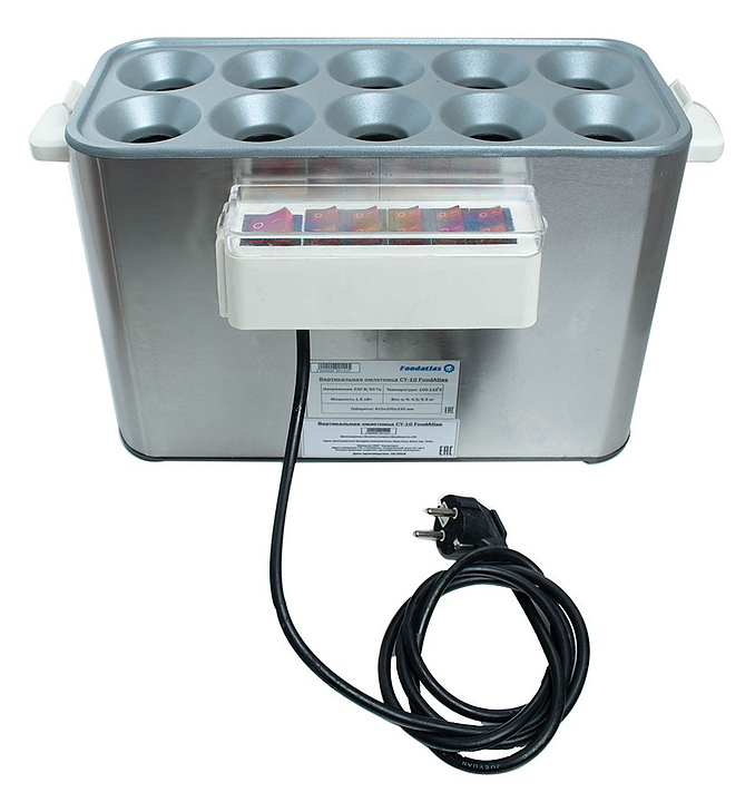 Вертикальная омлетница Foodatlas CY-10 предназначена для приготовления омлетов, булочек из яиц и других закусок из различных продуктов на предприятиях общественного питания и торговли. Модель оснащена съемным низом для очистки оборудования. Корпус выполнен из нержавеющей стали 430, верхняя панель и внутренняя часть - из алюминия с антипригарным покрытием, ручка и выключатели - из пластика. Дополнительные характеристики: