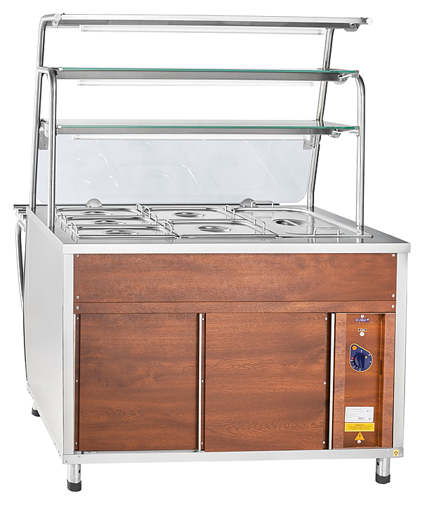 Мармит Abat ЭМК-70Т используется в составе линии раздачи Премьер для демонстрации, кратковременного хранения и поддержания вторых блюд в горячем состоянии в составе линий раздач на предприятиях общественного питания и торговли. Модель оснащена регулируемыми по высоте ножками. Конструкция выполнена из металла, кашированного под дерево. Особенности: