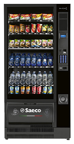 Торговый автомат Saeco Artico L предназначен для размещения в нем упакованной продукции в гостиницах, офисах, на предприятиях общественного питания и торговли и позволяет поддерживать необходимую температуру в постоянном режиме. Сухарики, чипсы, шоколадные батончики, напитки, орешки, сэндвичи и др. продукты помещаются в лотки со спиралями. При вращении спирали выбранный продукт попадает непосредственно в окошко выдачи. Корпус выполнен из стали. Особенности: