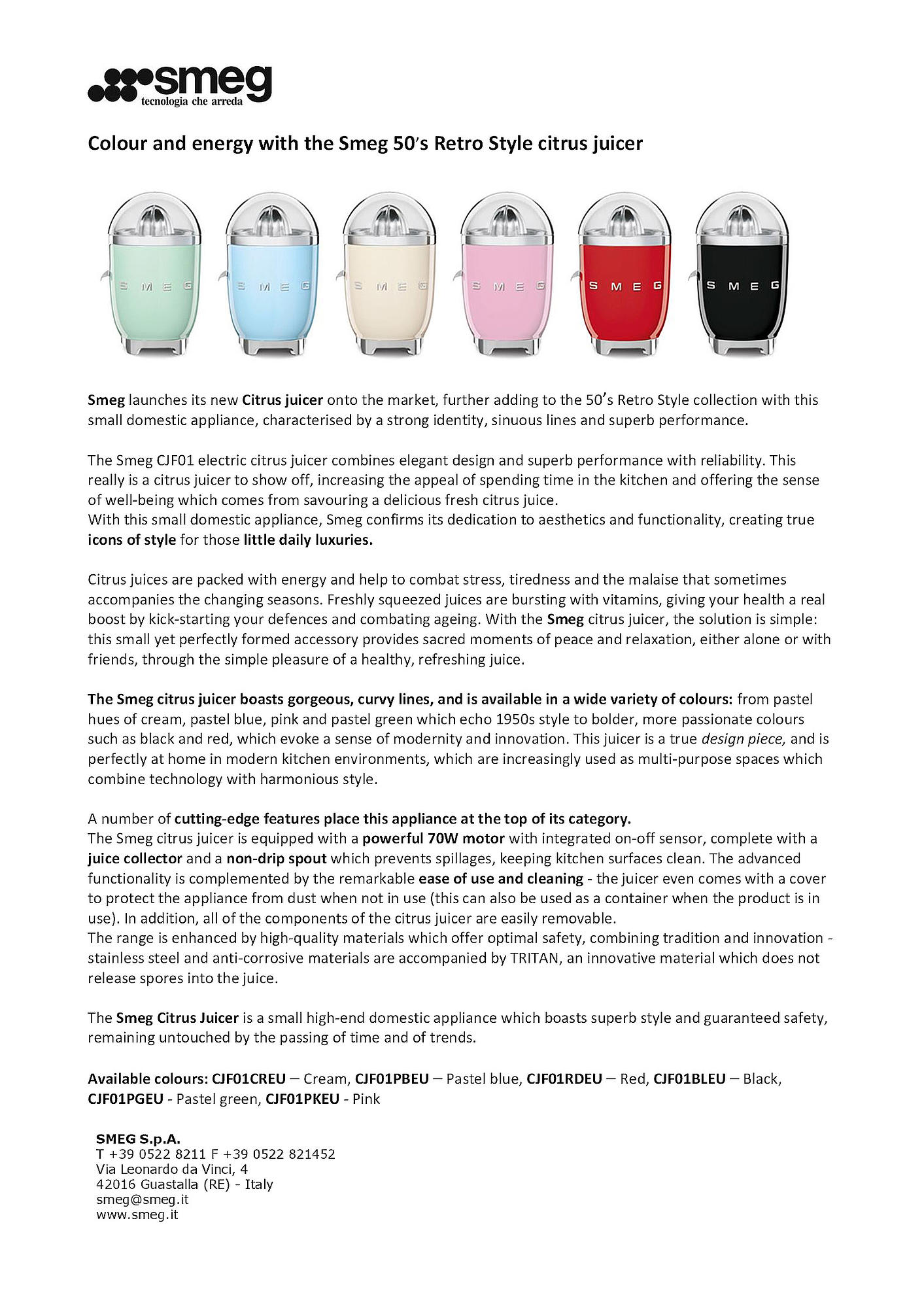 Соковыжималка Smeg CJF01WHEU используется в частных домах и квартирах для приготовления сока из цитрусовых фруктов. Модель выполнена в стиле 50-х годов. Корпус изготовлен из литого алюминия, выжимной конус, фильтр и носик - из нержавеющей стали, чаша и крышка - из TritanTM без бис-фенола A (BPA free). Особенности: