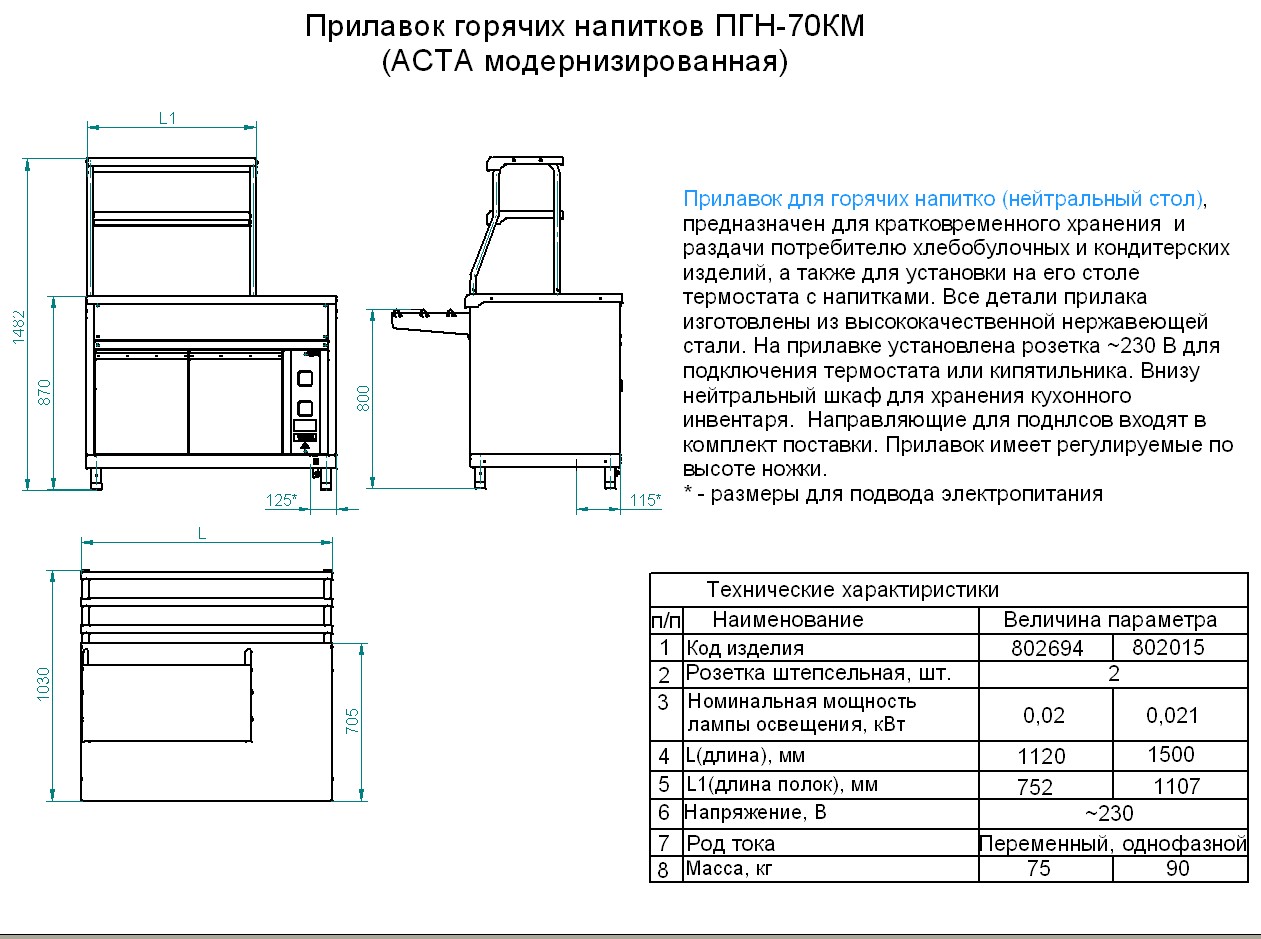 Прилавок для горячих напитков Abat ПГН-70КМ используется в составе линии раздачи Аста для демонстрации, кратковременного хранения и последующей раздачи хлебобулочных и кондитерских изделий, термостатов с напитками в составе линий раздач на предприятиях общественного питания и торговли. Модель оснащена регулируемыми по высоте ножками. Конструкция выполнена из металла, кашированного под дерево. Особенности: