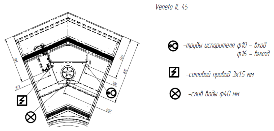 Холодильная витрина Italfrigo Veneto IС 45 Д предназначена для демонстрации, охлаждения и кратковременного хранения мяса, птицы, рыбы, колбасных, молочных и гастрономических изделий на предприятиях общественного питания и торговли. Фронтальная часть модели закрыта закаленным стеклом. Корпус выполнен из анодированого алюминия, поддоны выкладки, внутренняя задняя стенка с вентиляционными решётками и столешница - из нержавеющей стали. В комплект поставки входят набор для подключения к системе дренажа и комплект круглого фронтального отбойника. Холодильный агрегат, боковины и фронтальная нижняя декоративная панель с бампером не входят в комплект поставки и приобретаются отдельно. Комплектация монтажного набора: