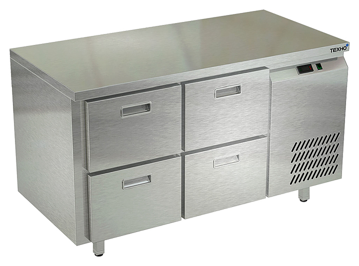 Холодильный стол Техно-ТТ СПБ/О-123/04-1306 предназначен для раскатки теста, обработки, охлаждения и кратковременного хранения продуктов и напитков на предприятиях общественного питания и торговли. Модель оснащена 4 секциями с 4 ящиками, направляющими с доводчиками (Австрия) и круглыми ножками, регулируемыми по высоте на 50 мм (Италия). Корпус выполнен из нержавеющей стали AISI 430, задняя стенка и дно - из оцинкованной стали. Стол поставляется в собранном виде. Особенности: