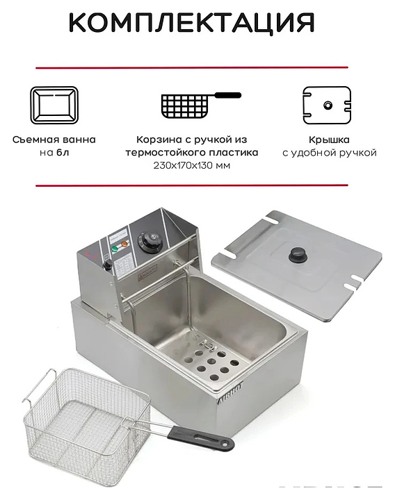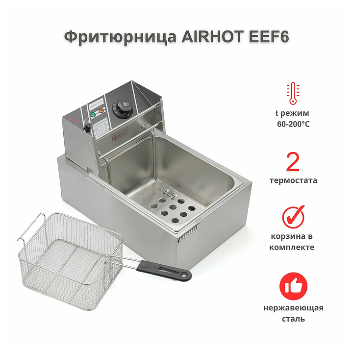 Фритюрница Airhot EEF6 предназначена для приготовления различных продуктов в большом количестве масла на предприятиях общественного питания и торговли. Модель оснащена электромеханической панелью управления с регулятором температуры и 2 термостатами: рабочим и аварийным. Корпус и ванна выполнены из нержавеющей стали, ручка - из термостойкого пластика. В комплект поставки входит корзина с ручкой. Особенности: