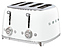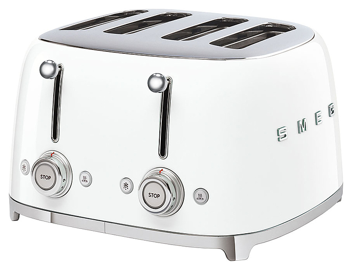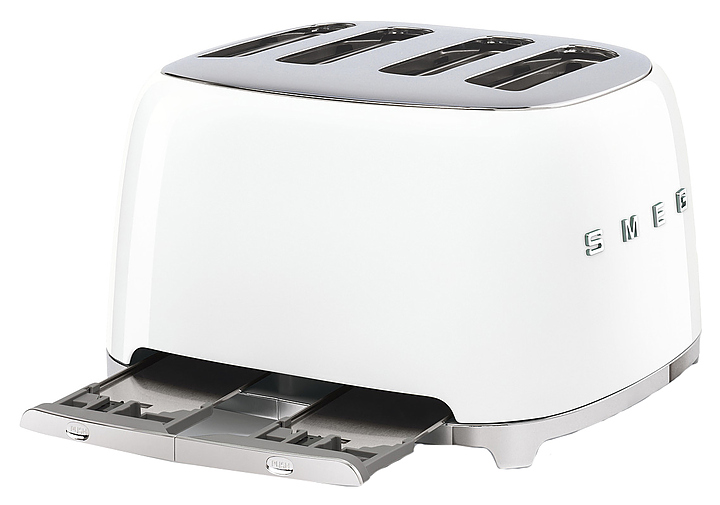 Тостер Smeg TSF03WHEU используется для обжаривания ломтиков тостового хлеба. С помощью дополнительно приобретаемых держателей тостер также можно применять для подогрева булочек или сэндвичей. Прибор отличается уникальным дизайном благодаря исполнению в стиле 50-х годов. В комплект поставки входят 2 съемных поддона из нержавеющей стали для крошек. Особенности: