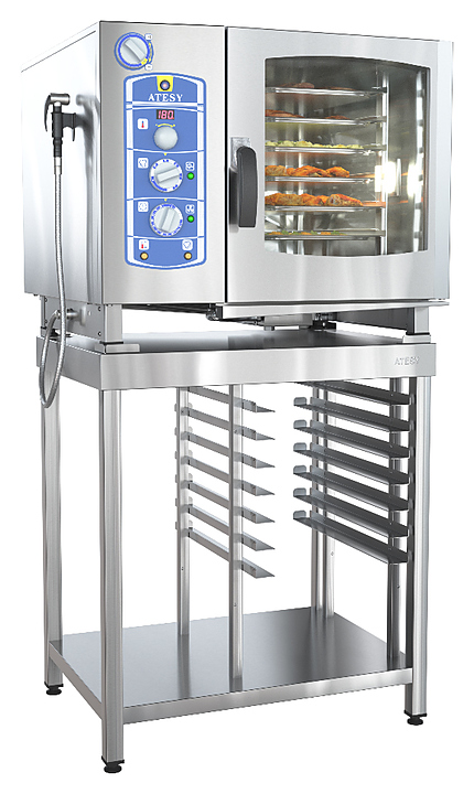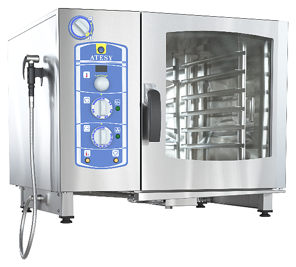 Пароконвектомат ATESY РУБИКОН АПК-6-1/1-Ииспользуется на предприятиях общественного питания и торговли для приготовления широкого спектра блюд как на пару, так и при помощи сухого нагрева. Модель оснащена набором поворотных ручек и энкодером, позволяющими легко задавать параметры работы. Изделие полностью выполнено из нержавеющей стали AISI 304, дверца камеры оснащена двойным стеклом.