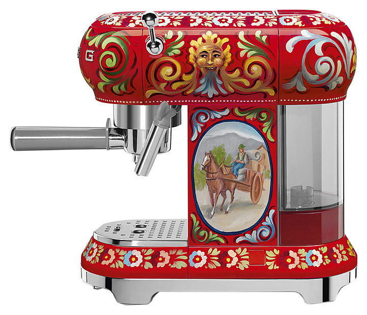 Кофемашина Smeg ECF01DGEU серии Dolce&Gabbana предназначена для приготовления эспрессо и кофейных напитков на его основе в частных домах и квартирах. Модель выполнена в стиле 50-х годов. Корпус изготовлен из окрашенного металла и цветного пластика, основание - из хромированного пластика, держатель фильтра, рамка, капучинатор и поддон для чашек - из нержавеющей стали. Комплектация: