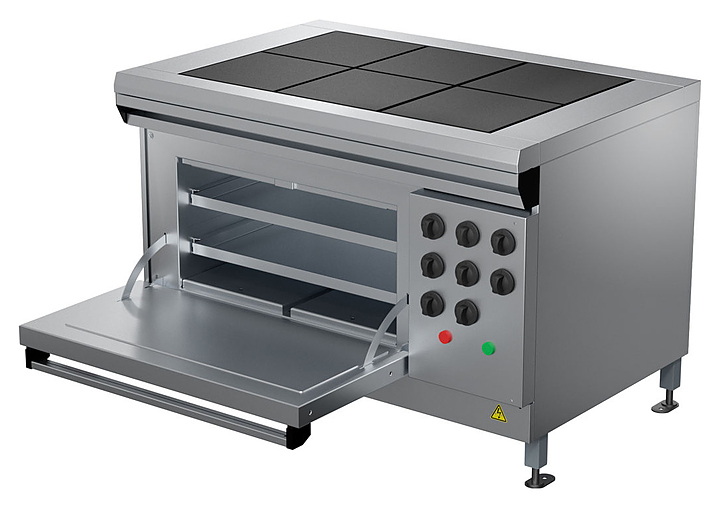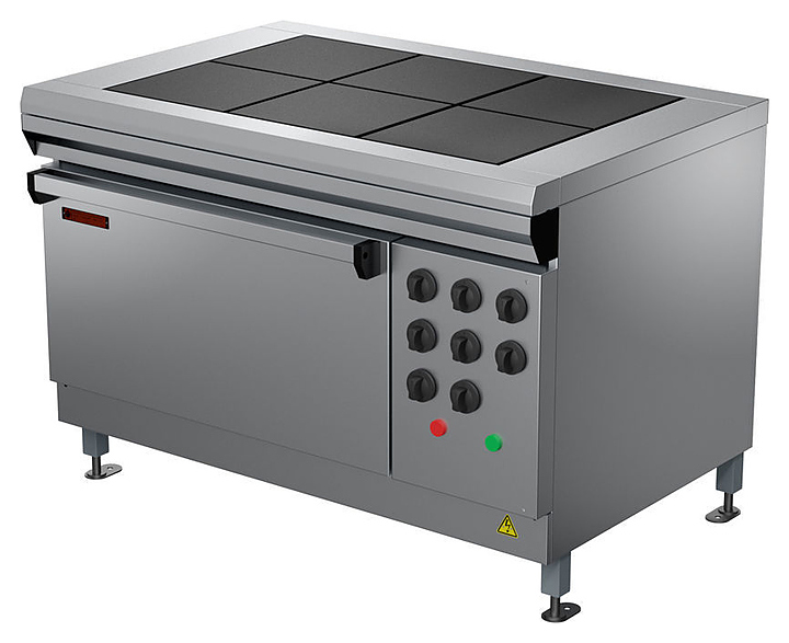 Электрическая плита Проммаш ПЭ-0,54ШП используется на предприятиях общественного питания и торговли для приготовления первых, вторых и третьих блюд в наплитной посуде, а также для жарки полуфабрикатов из мяса, рыбы, овощей. Корпус изготовлен из черного металла с полимерным покрытием, рабочий стол плиты и лицевые панели - из нержавеющей стали. В комплект поствки входят 4 противня GN 1/1 для духового шкафа. Дополнительные характеристики:
