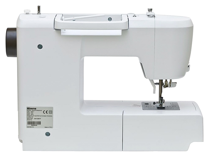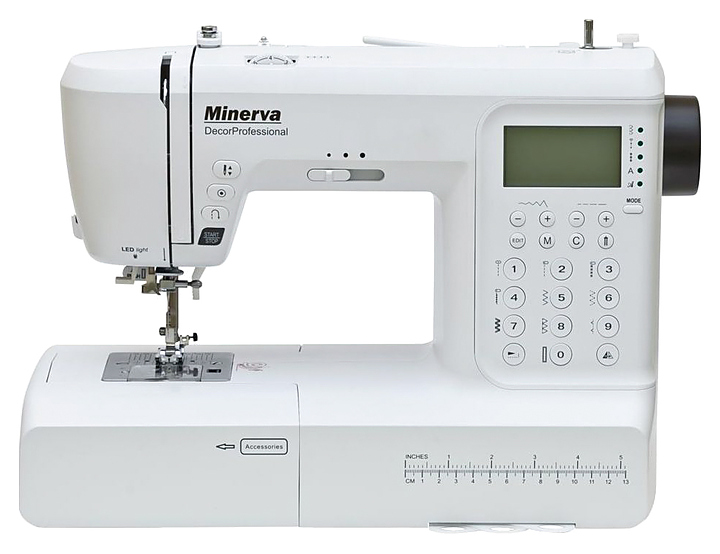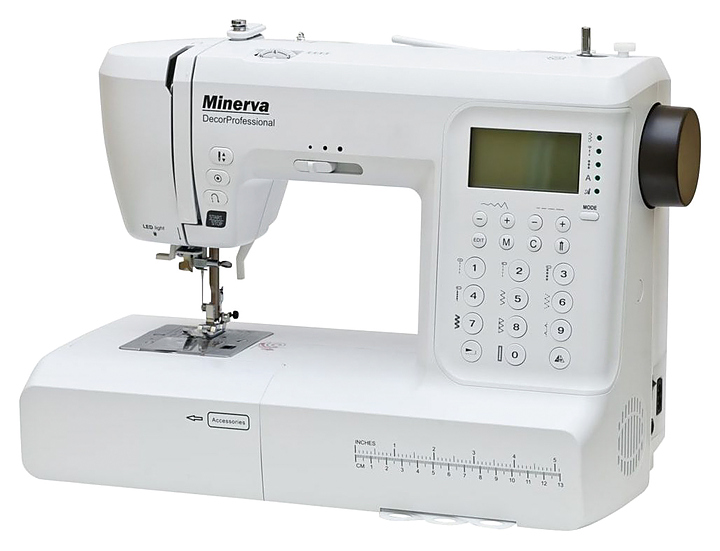 Швейная машина Minerva DecorProfessional используется в квартирах, коттеджах и частных домах для сшивания и отделки деталей из различных видов тканей. Модель оснащена электромеханическим управлением с графическим дисплеем, LED-подсветкой, отсеком для хранения аксессуаров и ручкой для переноски. В комплект поставки входят 3 шпульки, 7 лапок (универсальная, для вшивания молнии, для пришивания пуговиц, для петли, для потайной строчки, для сборки, для штопки и вышивки), большой и маленький держатели катушки, дополнительный стержень для катушки, двойная игла, L-образная отвертка, масленка, направляющая для краев выстегивания, кисточка-вспарыватель, педаль и мягкий чехол. Особенности: