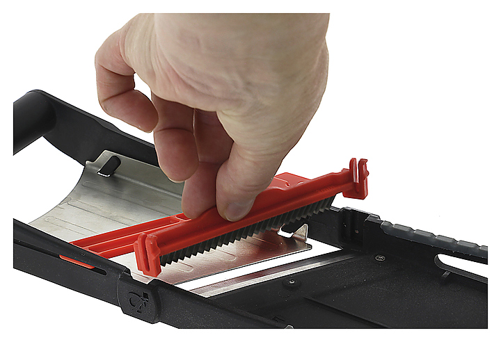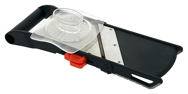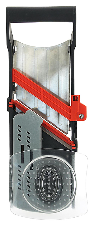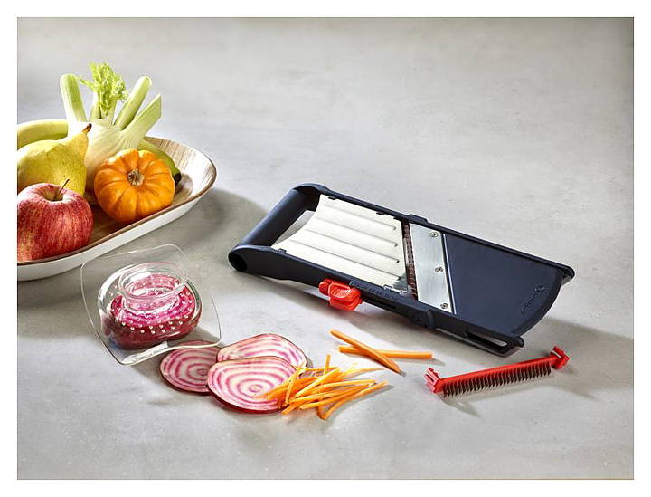 Мандолина De Buyer 2018.00 серии Komi предназначена для чистки и нарезания овощей и фруктов на предприятиях общественного питания и торговли, в частных домах и квартирах. Аксессуар выполнен из нержавеющей стали и полимерного материала. Рама подходит для ручной мойки, нож - для мытья в посудомоечной машине. В комплект поставки входят: