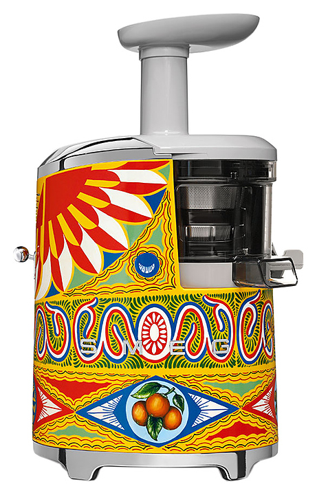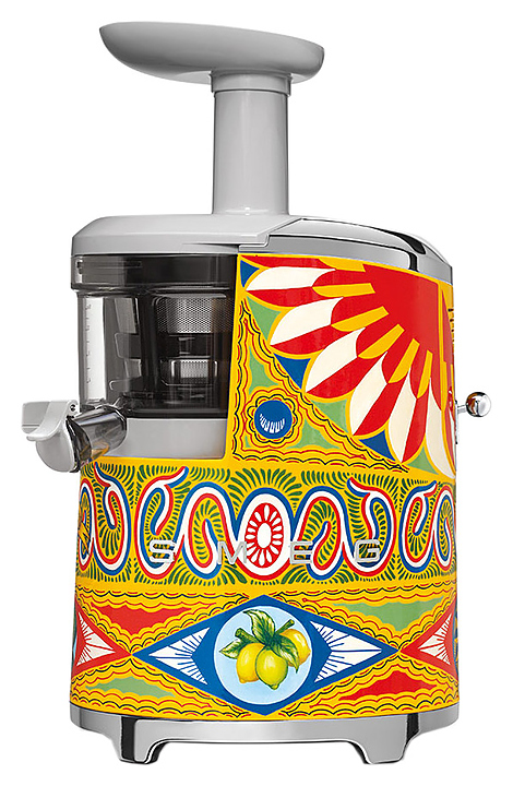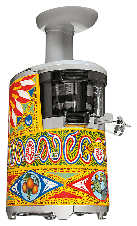 Шнековая соковыжималка Smeg SJF01DGEU серии Dolce&Gabbana предназначена для приготовления пюре, ореховой пасты, коктейлей и соков из фруктов, овощей, ягод, трав, иголок хвойных деревьев, пророщенных семян овса, пшеницы, ржи и чечевицы в частных домах и квартирах. Модель выполнена в стиле 50-х годов. Шнек и чаша отжима изготовлены из ULTEM™, рычаг включения - из стали. Комплектация: