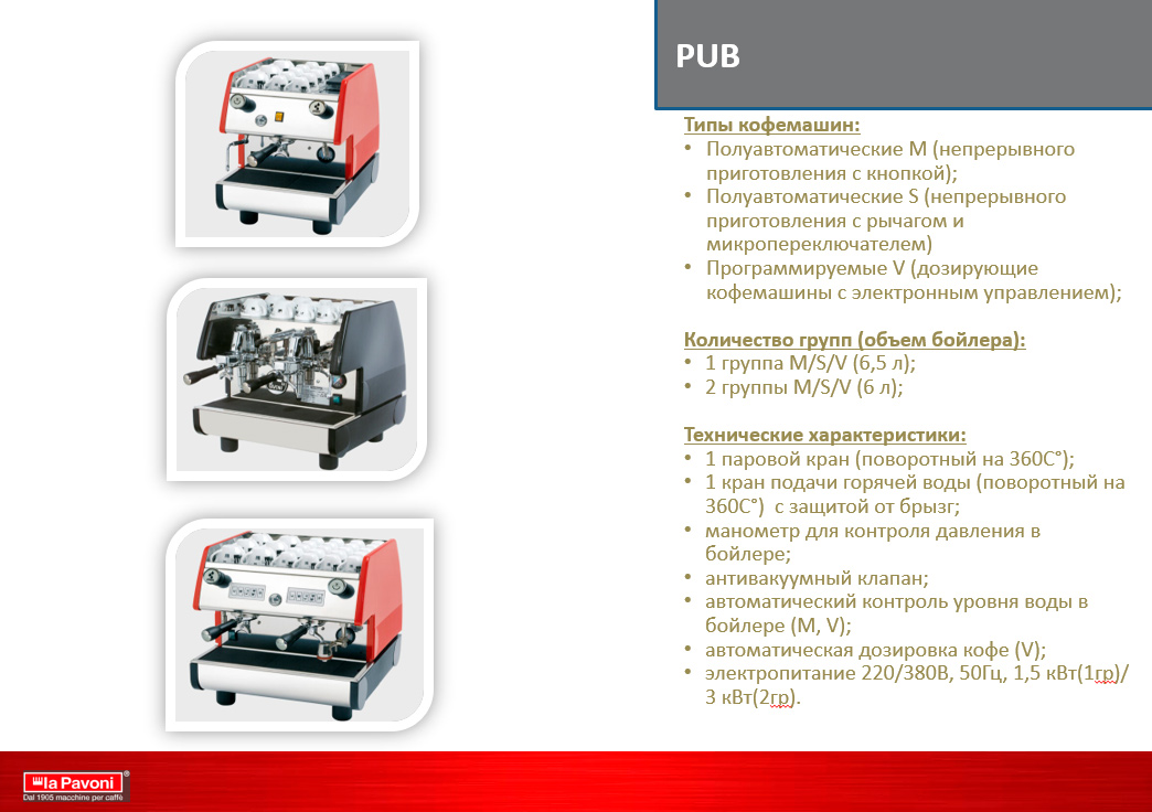 Кофемашина La Pavoni PUB1V серии PUB используется на предприятиях общественного питания и торговли, в офисах, а также в домашних условиях для приготовления чая, кофе и кофейных напитков. Модель оснащена 1 литой никелированной латунной группой с вертикальной инфузионной камерой. Бойлер выполнен из меди. В комплект поставки входят 2 холдера: с одним и двумя носиками. Особенности: