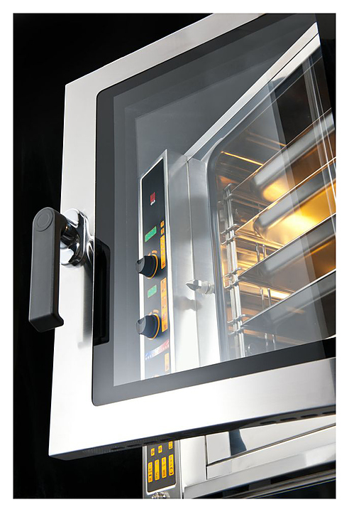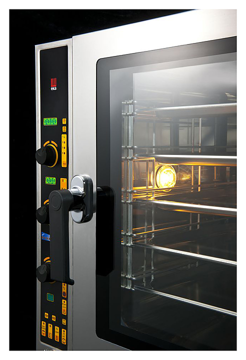 Пароконвектомат Tecnoeka EKF 711 E UD серии Evolution предназначен для приготовления широкого спектра блюд: мяса, рыбы, птицы, морепродуктов, овощей, гарниров и выпечки на предприятиях общественного питания и в производственных цехах, деятельность которых связана с выпуском гастрономических товаров. Устройство позволяет одновременно осуществлять приготовление сразу нескольких блюд без смешения их запахов и вкусов. Прибор оснащен улучшенной панелью управления, снабженной 2 дисплеями, отражающими параметры температуры и времени, 4 светодиодами, сигнализирующими о выбранной фазе готовки, а также полосой визуализации климата, кнопкой установки функций и охлаждения рабочей камеры. Пароконвектомат предлагает несколько вариантов климата работы внутренней камеры: от «сухого» жара до режима максимальной влажности и наоборот. Внутренняя подсветка и широкое двойное термостойкое стекло в распашной двери позволяют наблюдать за процессом приготовления блюда без необходимости открытия дверцы. Устройство предлагает возможность подключения термощупа. Режимы работы: