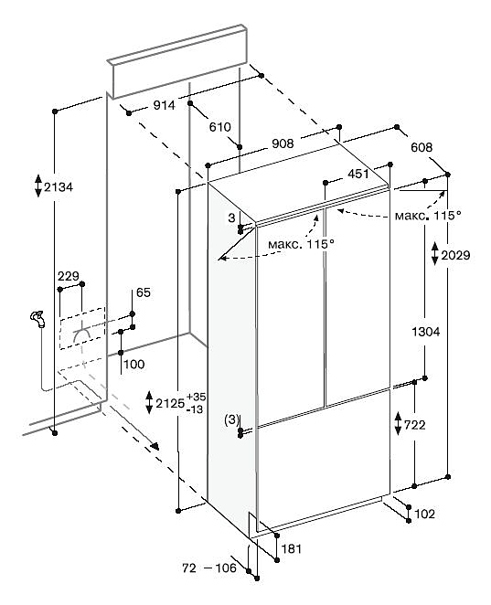 Стеклянные полки, одна из которых ассиметричная, вторая оснащена подъемным механизмом. Оптимальное использование пространства. Ледогенератор с прямым подключением к воде, встроенный в выдвижной морозильный ящик. Высота ниши для встраивания 213,4 см. Ширина ниши для встраивания 91,4 см. Общий объем 560 л. Полезный объем 530 л. Электронная регулировка температуры с цифровым индикатором. Динамическое охлаждение. Активный угольный фильтр. Автоматика оттаивания с испарением талой воды. Режим энергосбережения на время отпуска. Сигнал открытой двери и возникновения неисправности. Холодильное отделение