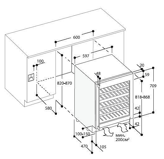 Две различные температурные зоны, регулировка температуры в диапазоне от 5° до 18°С. Вентиляция для увеличения влажности воздуха. Блокируемая дверь в раме из нержавеющей стали, освещение внутреннего пространства с функцией Dimm может быть использовано даже при закрытой дверце. Высота ниши для встраивания 82 см, ширина 60 см. Общий объем 127 л. Полезный объем 126 л. Вместимость до 41 бутылок (0,75 л, стандартной формы). Стеклянная дверца в рамке из нержавеющей стали. Две различные температурные зоны, регулировка температуры в диапазоне от +5° до +18°С в каждой температурной зоне. Угольный фильтр в каждой температурной зоне. Бесступенчатая регулировка температуры с цифровым 7-сегментным дисплеем. Динамическое охлаждение. Вентиляция для увеличения влажности. Три выдвижные полки из бука с алюминиевым профилем для хранения вина. Возможно хранение винных бутылок размера Magnum. Встроенное в верхнюю стенку камеры и в панель управления светодиодное освещение может быть использовано и при закрытой дверце. Блокировка двери. Потребление электроэнергии: 0,60 кВтч/сутки. Не содержит вредных для окружающей среды соединений FKW и FCKW. Специальные принадлежности: