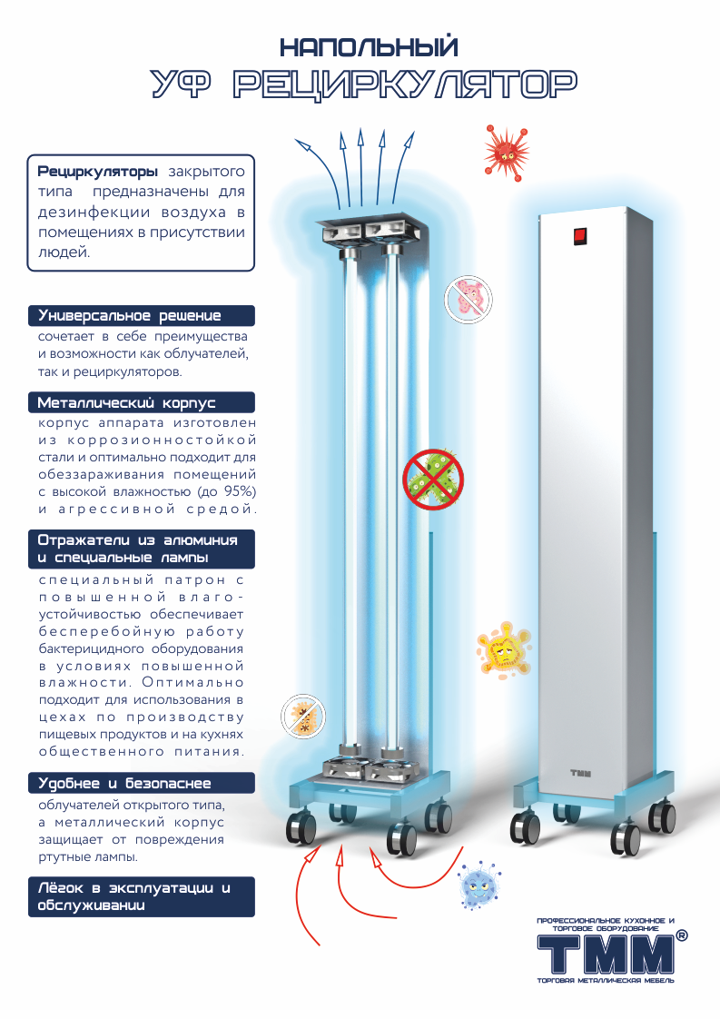 Бактерицидный рециркулятор ТММ РБУ-150 используется на предприятиях общественного питания и торговли, в офисах, образовательных и медицинских учреждениях, а также в других местах общественного пользования для обеззараживания воздуха в помещениях. Модель работает на 3 бактерицидных лампах, производящих ультрафиолетовое излучение, которое губительно влияет на практически все известные вирусы, болезнетворные бактерии и грибы. Корпус выполнен из окрашенного металла, отражатели - из алюминия. Подставка в комплект поставки не входит и приобретается отдельно. Особенности: