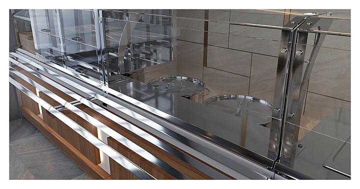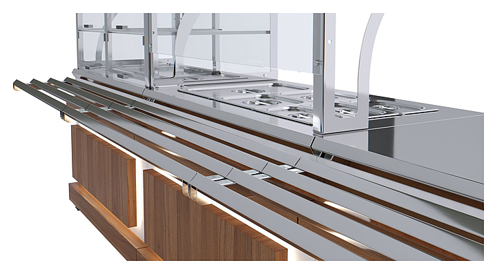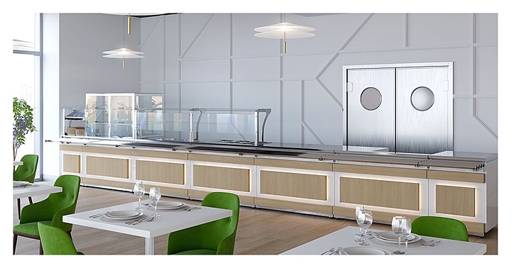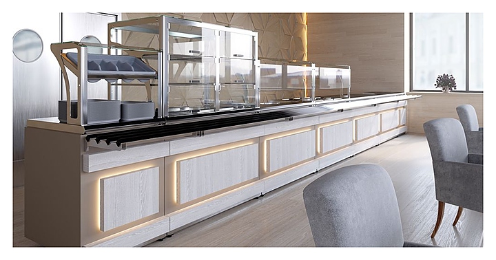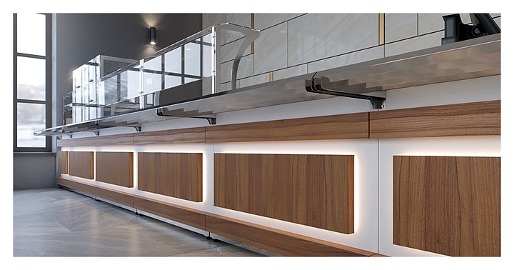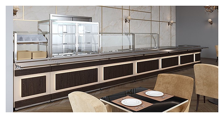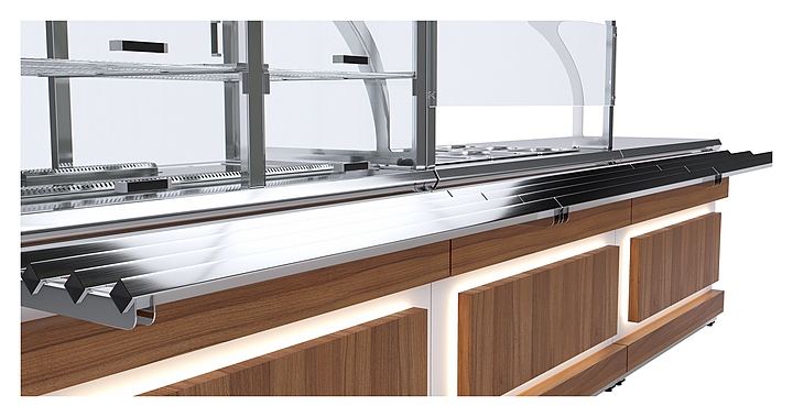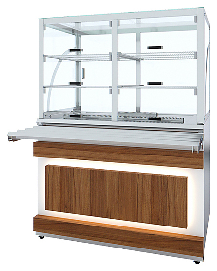 Холодильный прилавок Luxstahl ПХК (С)-1200 Premium Eco Wood используется в составе линии раздачи Eco Wood на предприятиях общественного питания и торговли для кратковременного хранения, демонстрации и раздачи холодных напитков, салатов, кисломолочных продуктов и других блюд, требующих хранения в охлажденном состоянии. Модель оснащена 4 хромированными подвесными полками-решетками, подсветкой и дверцами из прочного прозрачного поликарбоната. Каркас выполнен из нержавеющей стали AISI 430 толщиной 1 мм, стенки верхней части витрины - из закаленного стекла толщиной 6 мм, фасад - из ЛДСП, декоративные элементы - из массива сосны с различными вариантами тонировки, направляющая для подносов - из профильной трубы 25х25 мм. Особенности: