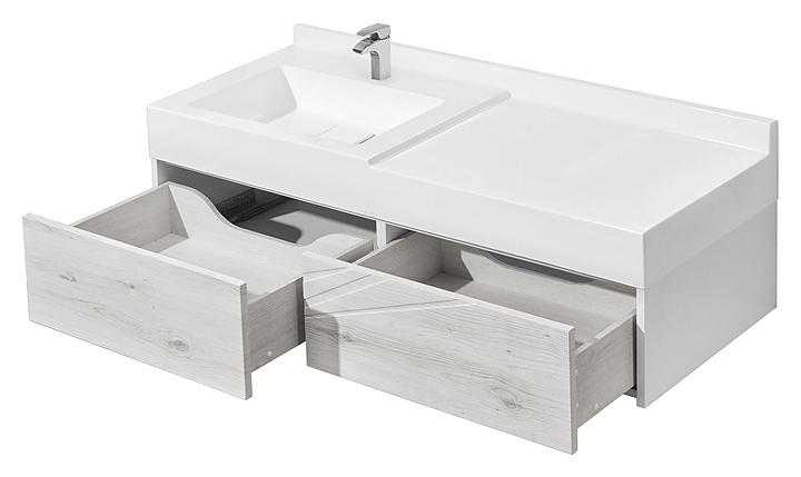 Тумба AQUATON Сакура 120 1A219701SKW80 выполнена в современном стиле. Благодаря подвесной конструкции изделие не занимает много места, а крыло чуть ниже уровня чаши позволяет функционально использовать пространство для хранения принадлежностей для ванной комнаты. Модель оснащена двумя ящиками полностью выдвигающимися, установленными на бесшумные направляющие скрытого монтажа, оснащенными системой push-to-open. Изделие выполнено из влагостойкой ЛДСП, окрашенной полиэфирной краской ультрафиолетового отверждения, фасад - из высококачественной МДФ. Тумба используется вместе с раковинами Сакура 120 1A71893KSK010 и Сакура 120 1A72433KSK010, позволяющей использовать ванную комнату двум членам семьи одновременно. Особенности: