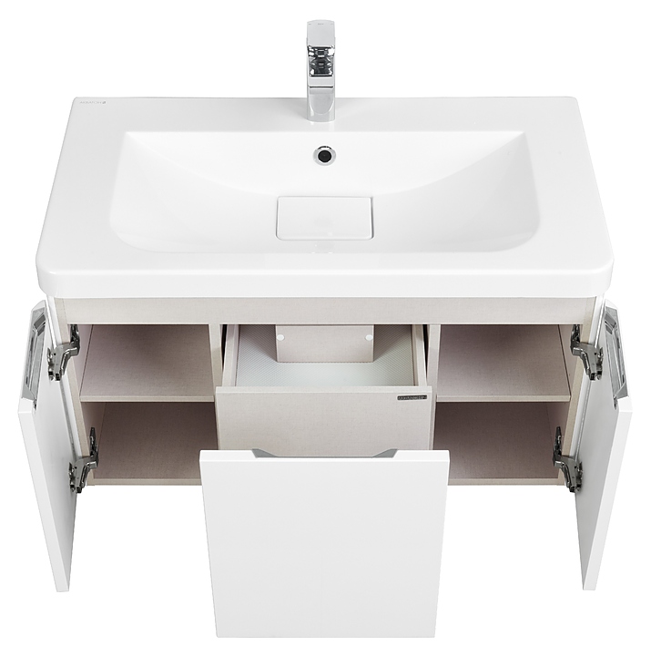 Тумба AQUATON Шерилл 85 1A208801SH010 выполнена в современном стиле. Благодаря подвесной конструкции изделие не занимает много места, а закругленные углы обеспечивают легкий уход. Модель оснащена двустенным ящиком полного выдвижения с системой плавного закрывания, внутренним ящиком с системой push-to-open, а за боковыми распашными фасадами находятся дополнительные отсеки с полками. Изделие выполнено из влагостойкой ЛДСП и фасады из МДФ покрыты белой глянцевой краской ультрафиолетового отверждения, которая обеспечивает изделию привлекательный внешний вид, а также износостойкость и долговечность. Тумба используется вместе с раковиной Шерилл 85 1A71443KSH010. Особенности: