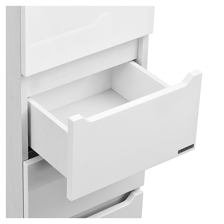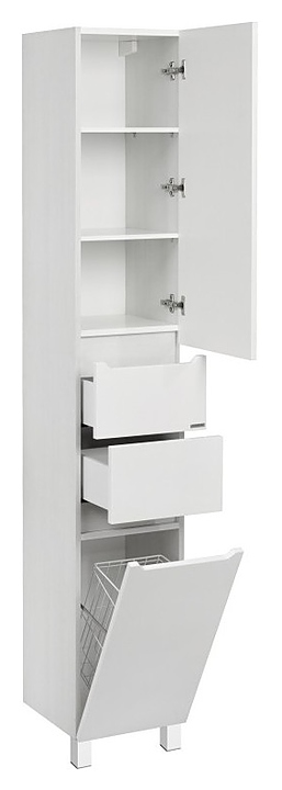 Напольный пенал AQUATON Дакота 1A203203DAAY0 выполнен в современном стиле и отлично дополнит интерьер любой ванной комнаты. Напольная конструкция обеспечивает легкий монтаж и не требует специального ремонта в помещении. Модель оснащена одной дверью, за которой находятся две полки, регулируемые по высоте, двумя небольшими ящиками и откидным ящиком с корзиной для белья в нижней части пенала. Боковые стенки изделия выполнены из текстурированной влагостойкой ЛДСП в цвете выбеленное дерево, а фасады окрашены в белый глянец полиэфирной краской ультрафиолетового отверждения, что полностью защищает поверхность от внешних воздействий, обеспечивает изделию привлекательный внешний вид, а также износостойкость и долговечность. Комплектация: