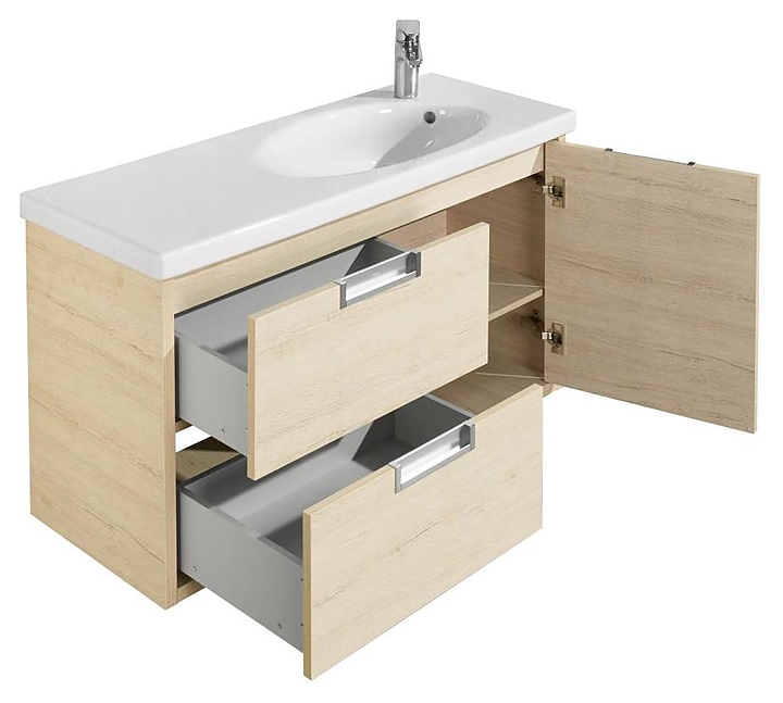 Тумба под раковину Roca Etna 7857302445 от популярного испанского бренда отлично дополнит интерьер ванной комнаты. Изделие выполнено в современном стиле. Модель оснащена ящиками и распашной дверцей с доводчиками. Мебель сборная и отличается простым монтажом. Корпус изделия выполнен из вгастойкой ЛДСП и покрыт глянцевой краской. Внимание! Тумба приобретается только вместе с раковинами Roca Etna 100 7327009000. Особенности: