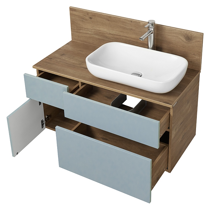 Тумба AQUATON Мишель 100 1A244101MIX30 выполнена в современном стиле. Благодаря подвесной конструкции изделие не занимает много места, а закругленные углы обеспечивают легкий уход. Модель оснащена слева небольшим выдвижным ящиком, под ним расположено отделение со створкой, а справа двумя вместительными ящиками с доводчиками. Корпус выполнен из влагостойкой ЛДСП в цвете дуб рустикальный, а фасады из МДФ покрыты матовой плёнкой цвета фьорд, что обеспечивает изделию привлекательный внешний вид, а также износостойкость и долговечность. На выбор возможно приобрести тумбу с традиционной столешницей из ВЛДСП или из керамогранита. Тумба используется вместе с раковиной Infinity 60 1AX169WBXX000. Комплектация: