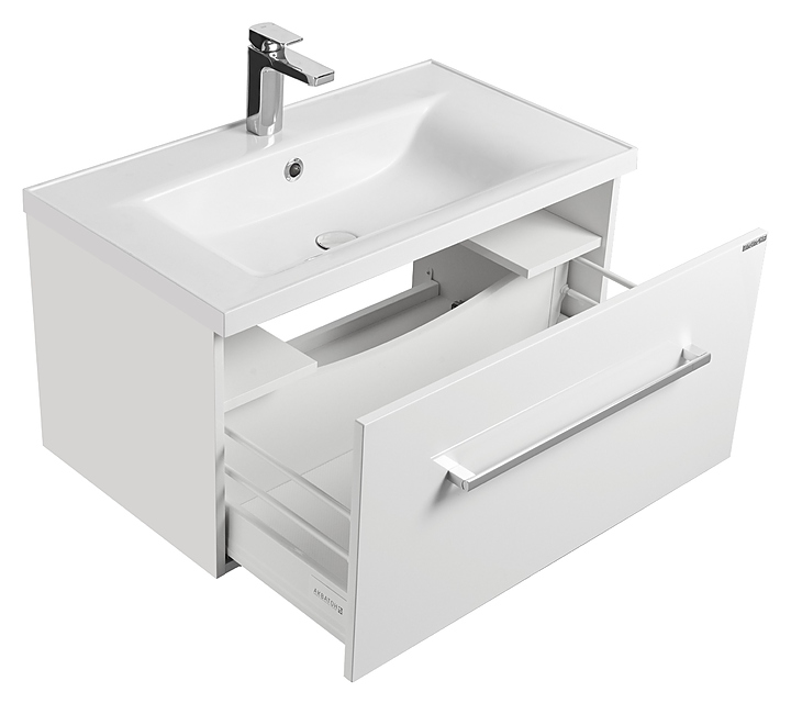 Тумба AQUATON Мадрид 80М 1A126801MA010 выполнена в классическом стиле. Благодаря подвесной конструкции изделие не занимает много места и обеспечивает легкую уборку в ванной комнате. Модель оснащена вместительным ящиком со встроенной системой плавного закрывания, а на дне ящика расположен антискользящий коврик. Корпус выполнен из влагостойкой ЛДСП, а фасад из высококачественной МДФ и покрыты белой полиэфирной краской ультрафиолетового отверждения с высокой степенью глянца, которая обеспечивает изделию привлекательный внешний вид, а также износостойкость и долговечность. Тумба используется вместе с раковинами Айрис 80 1A722931AG010 и Премьер 80 1A702831PR010. Комплектация: