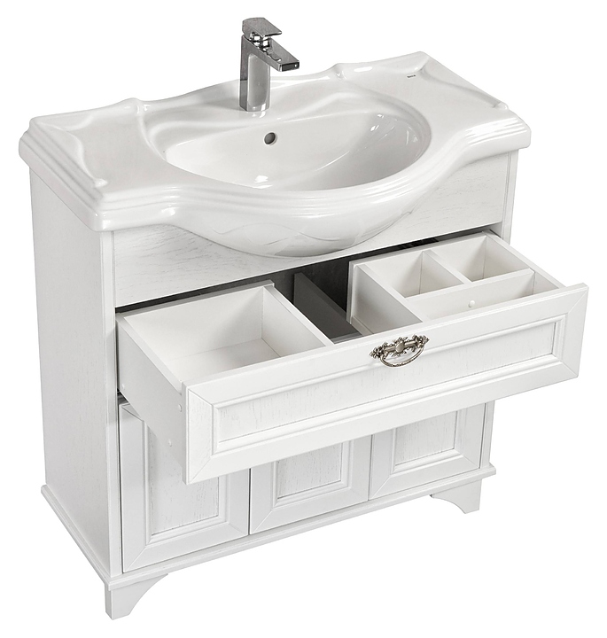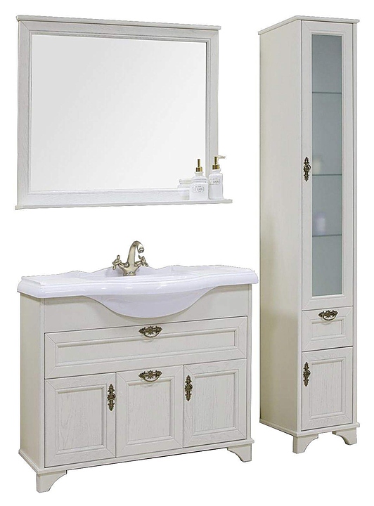 Тумба AQUATON Идель 105 1A197801IDM70 выполнена в классическом стиле. Напольная конструкция обеспечивает легкий монтаж и не требует специального ремонта в помещении. Модель оснащена выдвижным ящиком с внутренней системой организации и отсеков, распашными фасадами-створками и ещё одной створкой, за которыми находятся полки, что делает тумбу максимально функциональной. Корпус и фасады выполнены из массива дерева и отделаны натуральным шпоном в благородной расцветке белый дуб, что обеспечивает изделию привлекательный внешний вид, а также износостойкость и долговечность. Тумба используется вместе с раковиной Лаура 105 1A706831LU010. Комплектация:
