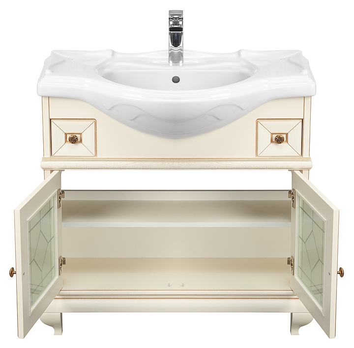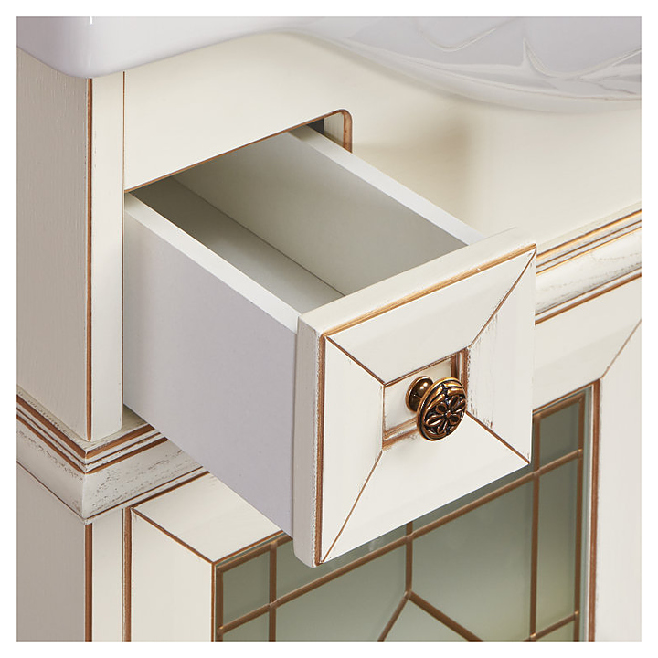 Тумба AQUATON Беатриче 85 1A191701BEM60 выполнена в классическом стиле. Напольная конструкция обеспечивает легкий монтаж и не требует специального ремонта в помещении. Модель оснащена двумя небольшими выдвижными ящиками, которые расположены слева и справа под раковиной и распашными фасадами-створками, за которыми находится полка, что делает тумбу максимально функциональной. Корпус и фасады выполнены из массива дерева и отделаны натуральным шпоном, а для декорирования фасадов используются вставки из стекла, что обеспечивает изделию привлекательный внешний вид, а также износостойкость и долговечность. Тумба используется вместе с раковиной Лаура 85 1A706731LU010. Комплектация: