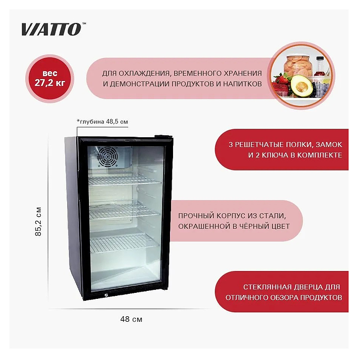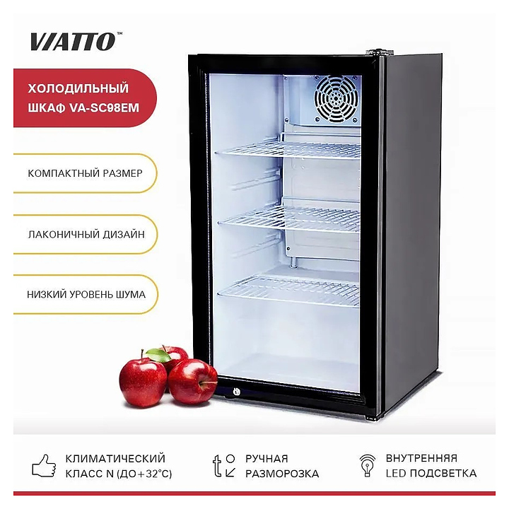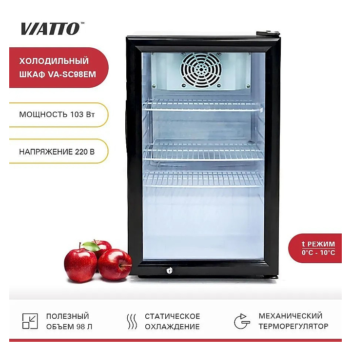 Холодильный шкаф VIATTO VA-SC98EM предназначен для охлаждения, временного хранения и демонстрации продуктов и напитков на предприятиях общественного питания и торговли. Модель оснащена распашной, стеклянной дверцей и рамой из нержавеющей стали и 3 решетчатыми полками. Корпус выполнен из окрашенной стали, внутренняя камера- из пластика.