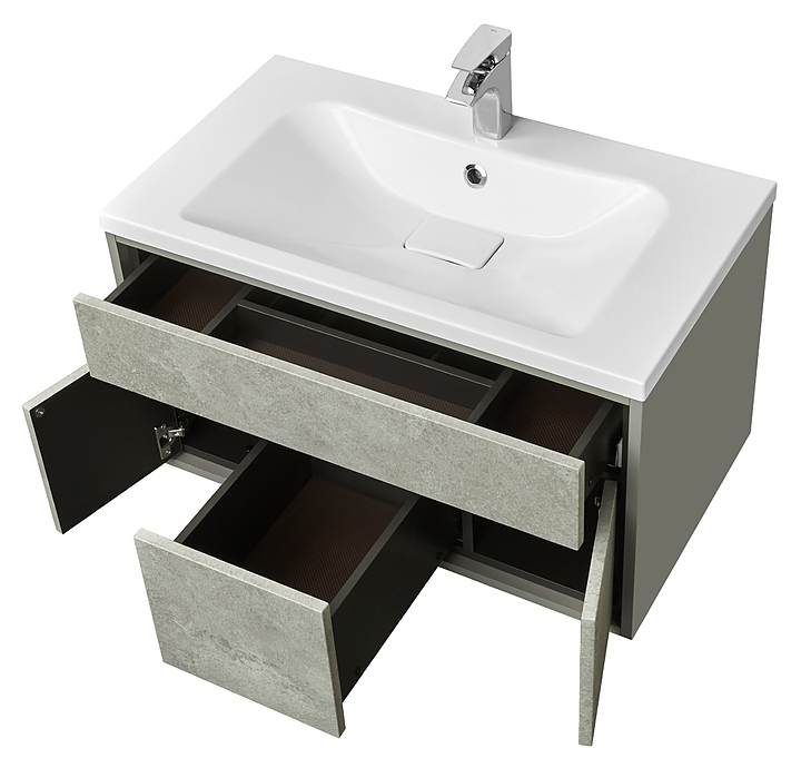 Тумба AQUATON Уэльс 80 1A214101WAC30 выполнена в современном стиле лофт. Благодаря подвесной конструкции изделие не занимает много места и обеспечивает легкую уборку в ванной комнате. Модель оснащена широким выдвижным ящиком с внутренней организацией хранения и антискользящими ковриками, глубоким выдвижным ящиком и двумя створками, что делает тумбу максимально функциональной и вместительной. Корпус изделия выполнен из влагостойкой ЛДСП, фасады из высококачественной МДФ покрыты матовой плёнкой цвета авеллино грей, а внутренняя отделка в цвете тёмный шоколад, что обеспечивает изделию привлекательный внешний вид, а также износостойкость и долговечность. Тумба используется вместе с раковиной Брук 80 1A71453KBC010. Комплектация: