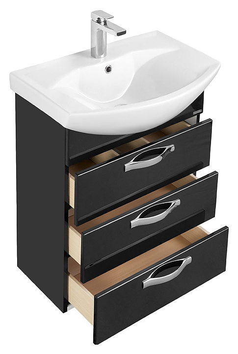 Тумба AQUATON Ария 50 Н 1A140201AA950 выполнена в современном стиле. Напольная конструкция обеспечивает легкий монтаж и не требует специального ремонта в помещении. Модель оснащена тремя выдвижными ящиками для хранения необходимых в ванной комнате принадлежностей, верхний ящик с системой организации пространства. Корпус изделия выполнен из влагостойкой ЛДСП, а фасад из высококачественной МДФ и окрашены чёрной глянцевой полиэфирной краской ультрафиолетового отверждения, которая обеспечивает изделию привлекательный внешний вид, а также износостойкость и долговечность. Тумба используется вместе с раковиной Santek Смайл 50 1WH207781. Комплектация: