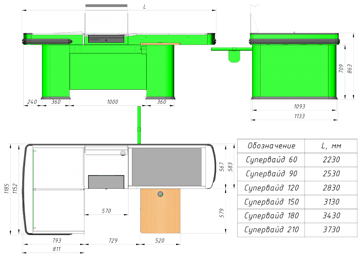 Кассовый бокс Commerce Renessance Супервайд 2790 см предназначен для упрощения обслуживания покупателей и проведения с ними взаиморасчетов в супермаркетах. Модель оснащена тумбой кассира, полками в основании, блоком розеток и боковой соединительной панелью. Изделие выполнено из стали, покрытой порошковой краской. В комплект поставки входят пульт управления и педаль движения транспортера. Модель доступна к заказу в синем, красном, оранжевом, желтом, темно-зеленом, светло-зеленом, сером, черном и фиолетовом цвете. Особенности: