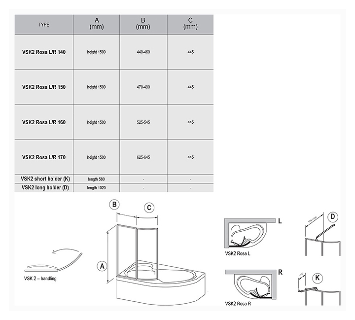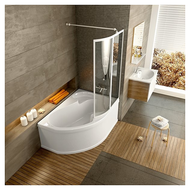 Шторка Ravak VSK2 Rosa предназначена для установки с ваннами. Шторка состоит из неподвижной и подвижной части, поворачивающейся вовнутрь ванны. Для лучшей фиксации шторку рекомендуется укрепить с помощью короткого или длинного держателей VSK2. Шторка отличается простым монтажом и можно устанавливать уже в готовую ванную комнату. Конструкция состоит из толстостенных алюминиевых профилей, а витражи выполнены из пластика в декоре Rain. Держатель VSK2 в комплект поставки не входит и приобретается отдельно. Шторка устанавливается на правые варианты ванн Rosa I, Rosa II и Rosa 95 шириной 150 см. Особенности:
