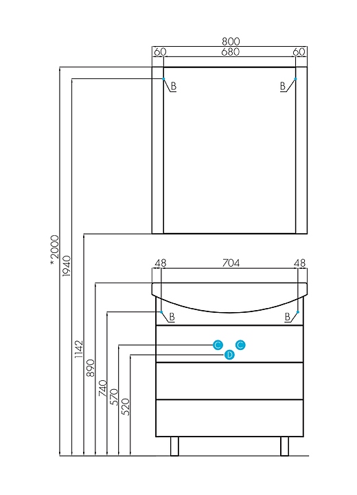• Высота с опорами с раковиной: 890 мм