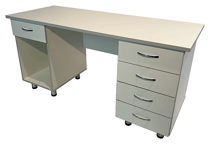 Медицинский стол Мед Мебель MD СМ 10.14 с РУ предназначен для организации рабочего места сотрудников медучреждений. Модель оснащена регулируемыми по высоте опорами для компенсации неровностей напольного покрытия и 2 боковыми тумбами: правая - с 4 выдвижными ящиками, левая - с выдвижным ящиком и вместительной нишей. Каркас обеспечивает жесткость, устойчивость и прочность конструкции. Столешница и каркас выполнены из ЛДСП. Стол поставляется с регистрационным удостоверением. Особенности: