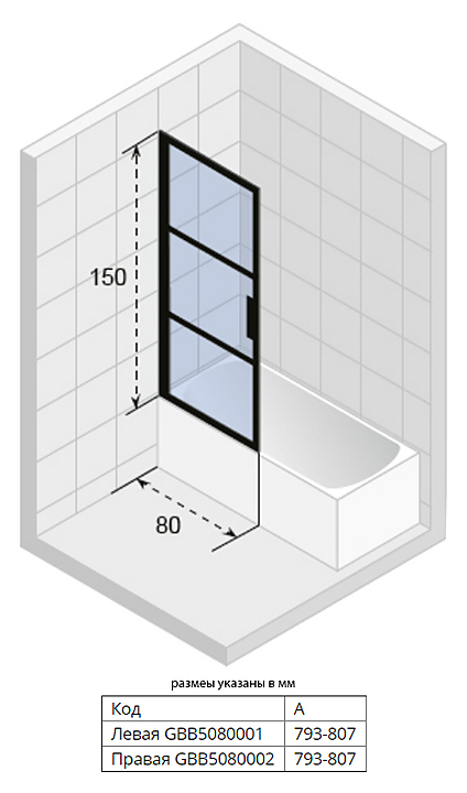 Шторка в ванну RIHO GRID GB501, 80х150 см, L
