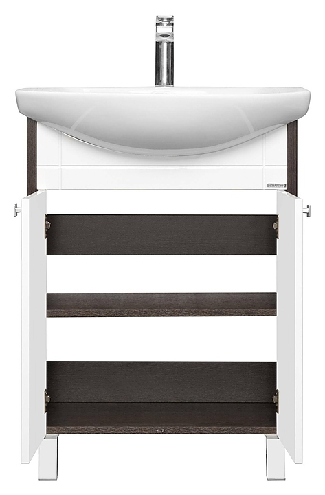 Тумба AQUATON Альпина 65 1A133401AL500 выполнена в современном стиле. Напольная конструкция обеспечивает легкий монтаж и не требует специального ремонта в помещении. Модель оснащена распашными фасад-створками с фрезеровкой, за которыми находится регулируемая по высоте полка.. Корпус изделия выполнен из влагостойкой ЛДСП в цвете венге, а фасады из высококачественной МДФ и окрашены белоснежной краской ультрафиолетового отверждения, что обеспечивает изделию привлекательный внешний вид, а также износостойкость и долговечность. Тумба используется вместе с раковиной Santek Балтика 65 1WH207775. Комплектация: