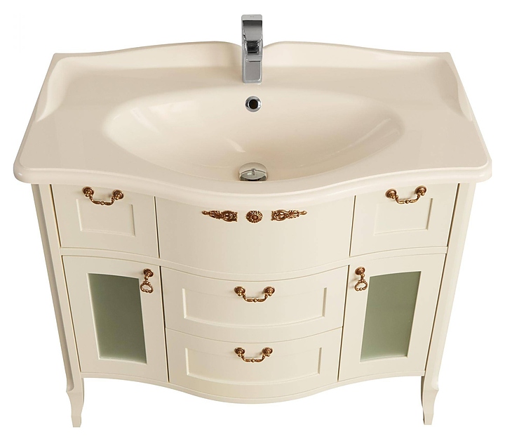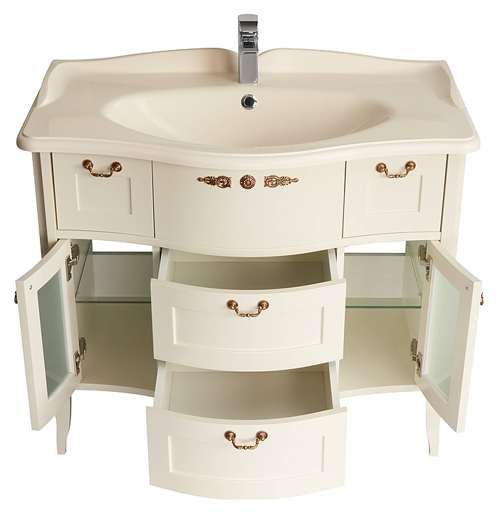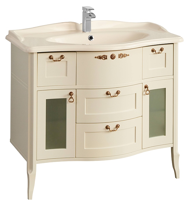 Тумба AQUATON Версаль 100 1A188001VSZA0 выполнена в классическом стиле. Напольная конструкция обеспечивает легкий монтаж и не требует специального ремонта в помещении. Модель оснащена двумя небольшими выдвижными ящиками, которые расположены слева и справа под раковиной, распашными фасадами-створками, за которыми находится полка и двумя вместительными выдвижными ящиками по центру, что делает тумбу максимально функциональной. Корпус выполнен из влагостойкой ЛДСП, фасады из высококачественной МДФ в отделке слоновая кость, что обеспечивает изделию привлекательный внешний вид, а также износостойкость и долговечность. Тумба используется вместе с раковиной Версаль 100 1A712431VS200. Комплектация: