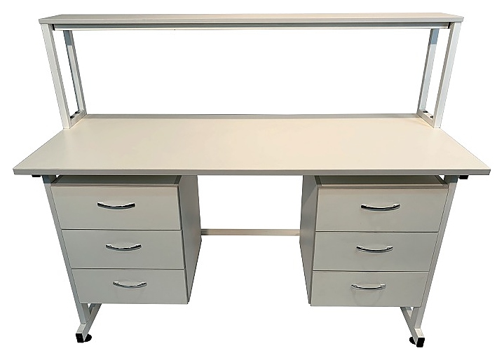 Лабораторный стол с надстройкой Мед Мебель СЛн 16.015 с РУ предназначен для оптимизации и рационального использования рабочего места сотрудников лабораторий. Модель оснащена надстройкой с полкой посередине столешницы над ней, 2 тумбами, с 3 ящиками каждая, и регулируемыми по высоте ножками за счет винтовых опор-регуляторов. Каркас обеспечивает надежность и прочность конструкции. Столешница и полки выполнены из ЛДСП, каркас - из стального профиля, покрытого порошковой краской. Стол поставляется с регистрационным удостоверением. Особенности: