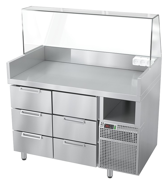 Станция ATESY Бавария БХС -1235.700-02-1 предназначена для комплексного оснащения рабочего места приготовления и продажи хот-догов и бургеров, а также для хранения предварительно охлажденных мясных полуфабрикатов, хлебобулочных изделий, начинок и соусов на предприятиях общественного питания и торговли. Модель оснащена встроенным контроллером управления температурным режимом станции с возможностью программирования, гастронормированными ящиками и нейтральной нишей для хранения инвентаря: щипцов, салфеток, одноразовой посуды. Все конструктивные элементы станции, контактирующие с продуктами питания, выполнены из нержавеющей стали. Особенности: