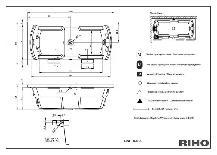Ванна RIHO LISA благодаря стильному современному дизайну и прямоугольной форме гармонично впишется в интерьер ванной комнаты. Сливное отверстие находится посередине, что позволяет располагаться в ванной с любой удобной стороны. Преимуществом этой модели является наличие системы гидромассажа, которая обеспечивает расслабляющий массаж и приятный отдых во время принятия ванны. Изделие выполнено из акрила Microban с антибактериальным покрытием Lucite, который мгновенно прогревается, обладает небольшим весом и высокими шумоизоляционными характеристиками, а также устойчив к механическим повреждениям, армированного стекловолокном с примесью полиэстера, дно усилено прочной ламинированной ДСП для большей прочности. Комплектация: