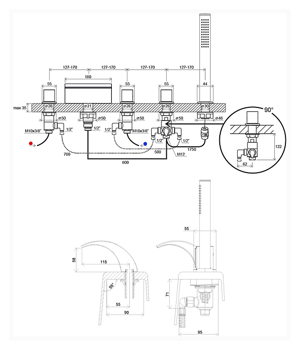 Смеситель для ванны и душа на 5 отверстий Ravak Waterfall WF 025.00 предназначен для использования в ванных помещениях для подачи горячей и холодной воды. Оригинальное сочетание практических и эстетических функций создает от водопада на ванне исключительный эффект. Изделие выполнено из высококачественной латуни, которая отличается прочностью, долговечностью и устойчивостью к перепадам температур. Смеситель подходит к ваннам RAVAK с достаточно широким и горизонтальным бортом: Gentiana, NewDay, Rosa I, Rosa II, Rosa 95, LoveStory II, Asymmetric, Formy 01, Formy 01 Slim, асимметричная ванна 10°, City, City Slim, Freedom W. Особенности: