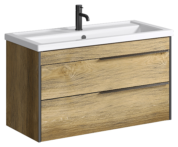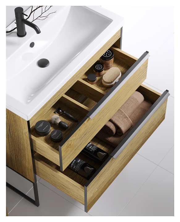 Тумба Aqwella Fargo FRG0110DB с легкостью впишется в интерьер любой ванной комнаты. Подвесная конструкция и отсутствие ножек создают иллюзию парения в воздухе и упрощают уборку, однако при монтаже гарнитур можно сделать напольным, добавив в набор ножки необходимого размера. Ящики тумбы оснащены скрытыми направляющими с системой мягкого закрывания. Особенностью данной модели являются алюминиевые ручки в черном цвете, которые можно разместить справа, слева или по центру верхнего края ящика. Фасады и корпус выполнены из ЛДСП в цвете дуб балтийский с кромкой матового черного цвета. Тумба используется вместе с раковиной Фостер 1000. Для установки понадобится набор крепежей для монтажа на стену. Дополнительные характеристики: