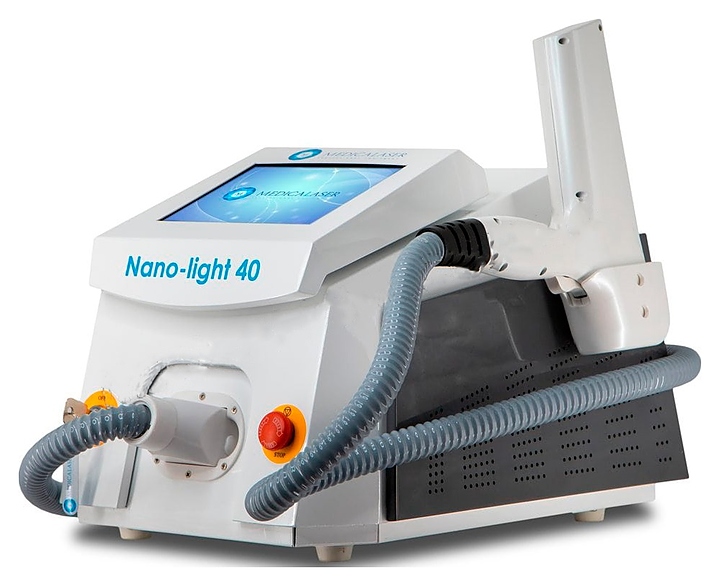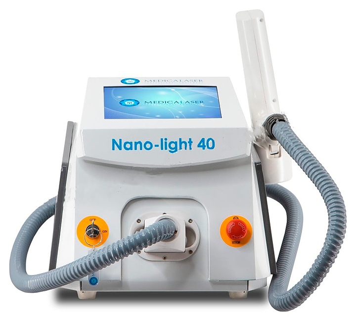 Косметологический лазер MedicaLaser Nano-Light 40 используется в косметологических и хирургических кабинетах для удаления пигментации, грибковых заболеваний ногтей, для процедур карбонового пилинга, удаления черных и цветных татуировок и других косметологических процедур. Модель оснащена экраном и устойчивыми ножками. Корпус и ручки выполнены из высокопрочного пластика. В комплект поставки входят манипула, кабель питания, ножной выключатель, очки мастера, очки клиента, насадки 1064 и 532 нм, система залива воды. Особенности: