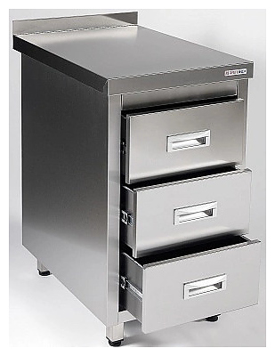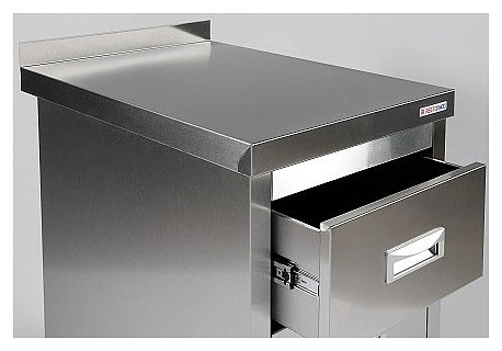 Производственный стол Restoinox СП3Я-5/7-Б предназначен для обработки продуктов питания, раскатки теста и хранения кухонного инвентаря, также для размещения малогабаритного оборудования на предприятиях общественного питания и торговли. Модель оснащена регулируемыми по высоте опорами и выдвижными ящиками. Ножки выполнены из квадратной трубы 40х40 мм из нержавеющей стали Aisi 430, корпус, рабочая поверхность и ящики - из нержавеющей стали Aisi 430, задняя стенка - из оцинкованной стали, столешница усилена листом ЛДСП. Особенности: