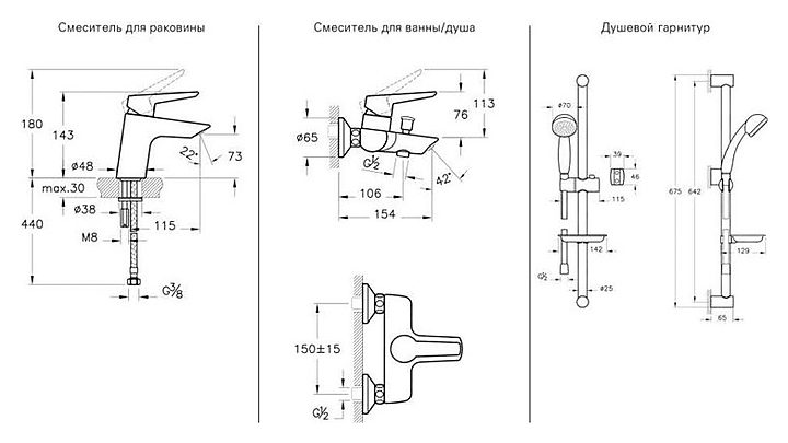 Набор смесителей Vitra Solid S A49227EXP предназначен для использования в ванных помещениях для подачи горячей и холодной воды. Набор включает в себя смеситель на раковину, смеситель для ванны и душа и душевой гарнитур. Этот комплект является идеальным сочетанием цены и качества, а также привлекает своими геометрическими, тонкими и минималистскими контурами. Квадратный дизайн коллекции Solid S для небольших раковин делает небольшие ванные комнаты более удобными. Для очистки внешней поверхности используйте мягкую ткань, смоченную в спирте или мыле, никогда не используйте кислоты или соляную кислоту. Изделие выполнено из высококачественной латуни, которая отличается прочностью, долговечностью и устойчивостью к перепадам температур. В комплект поставки входит набор креплений и инструкция. Особенности: